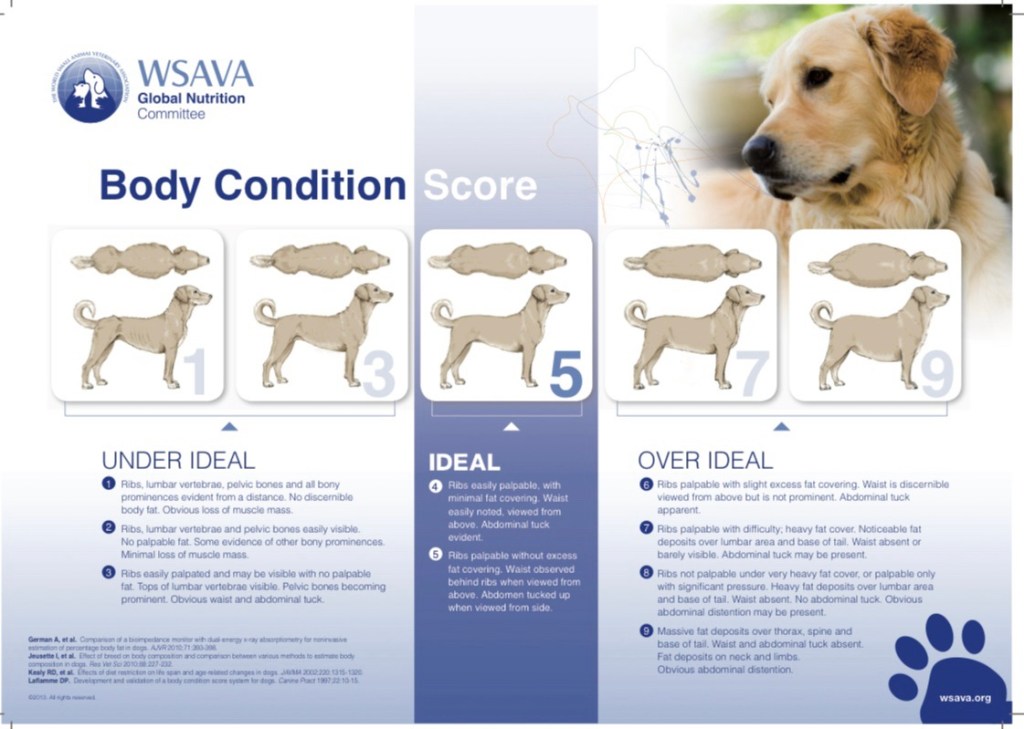 Below is a Body Conditioning Score chart for you to check your dog. A good tip if you have a very thick, hairy coated dog is to check when they’re wet!